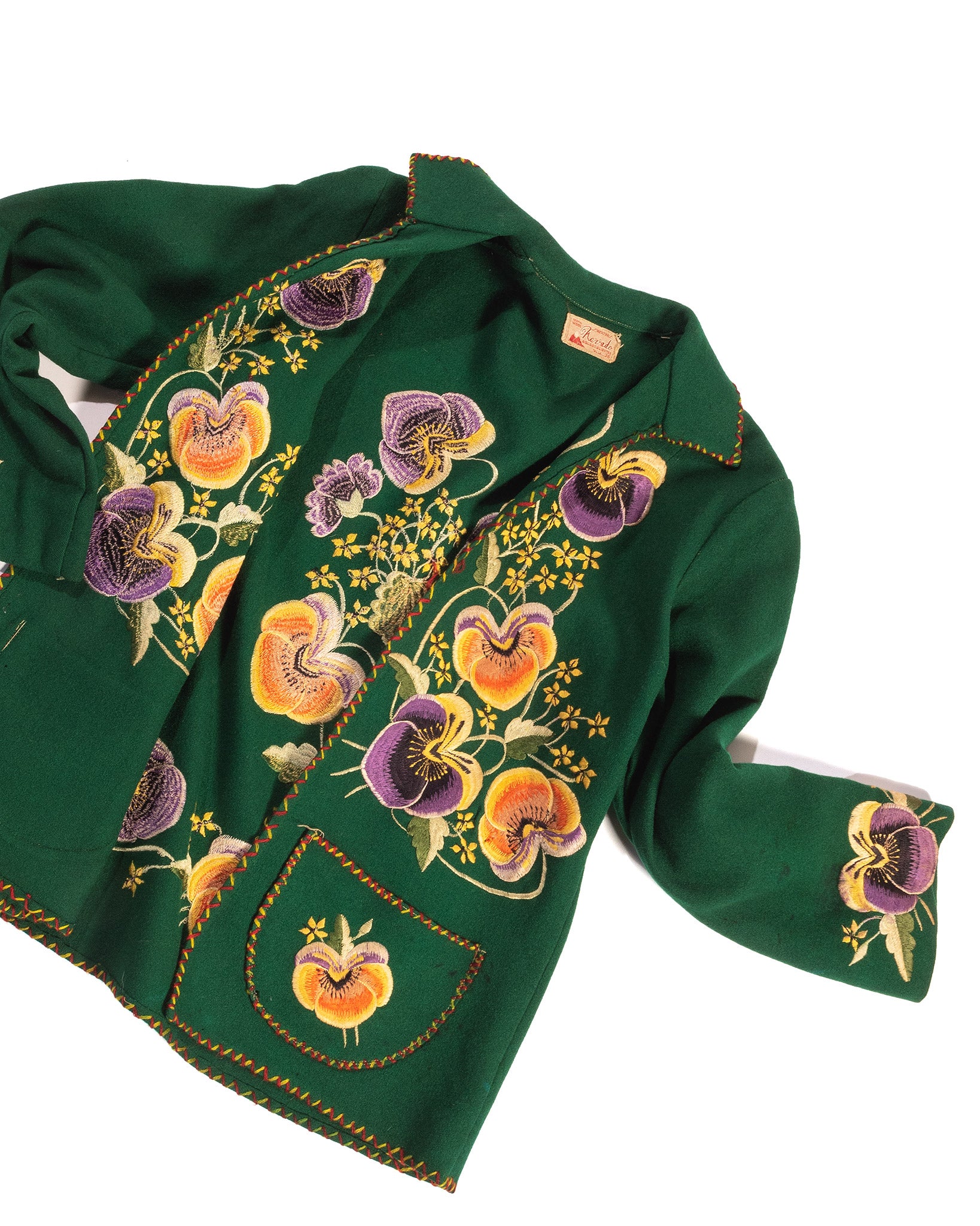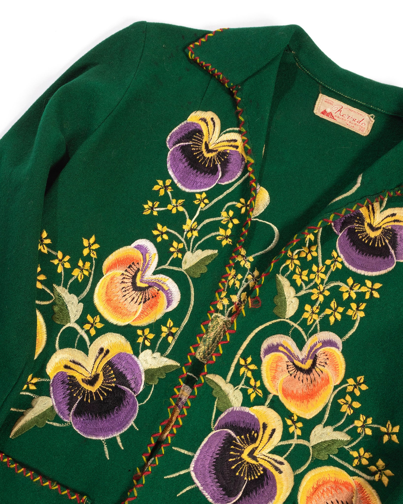 Incredible: wool jacket with purple and orange pansy embroidery on the front of jacket and sleeve cuffs. hand stitched detail in red and yellow surrounding the hem, collar & front pockets. this precious garment has flaws