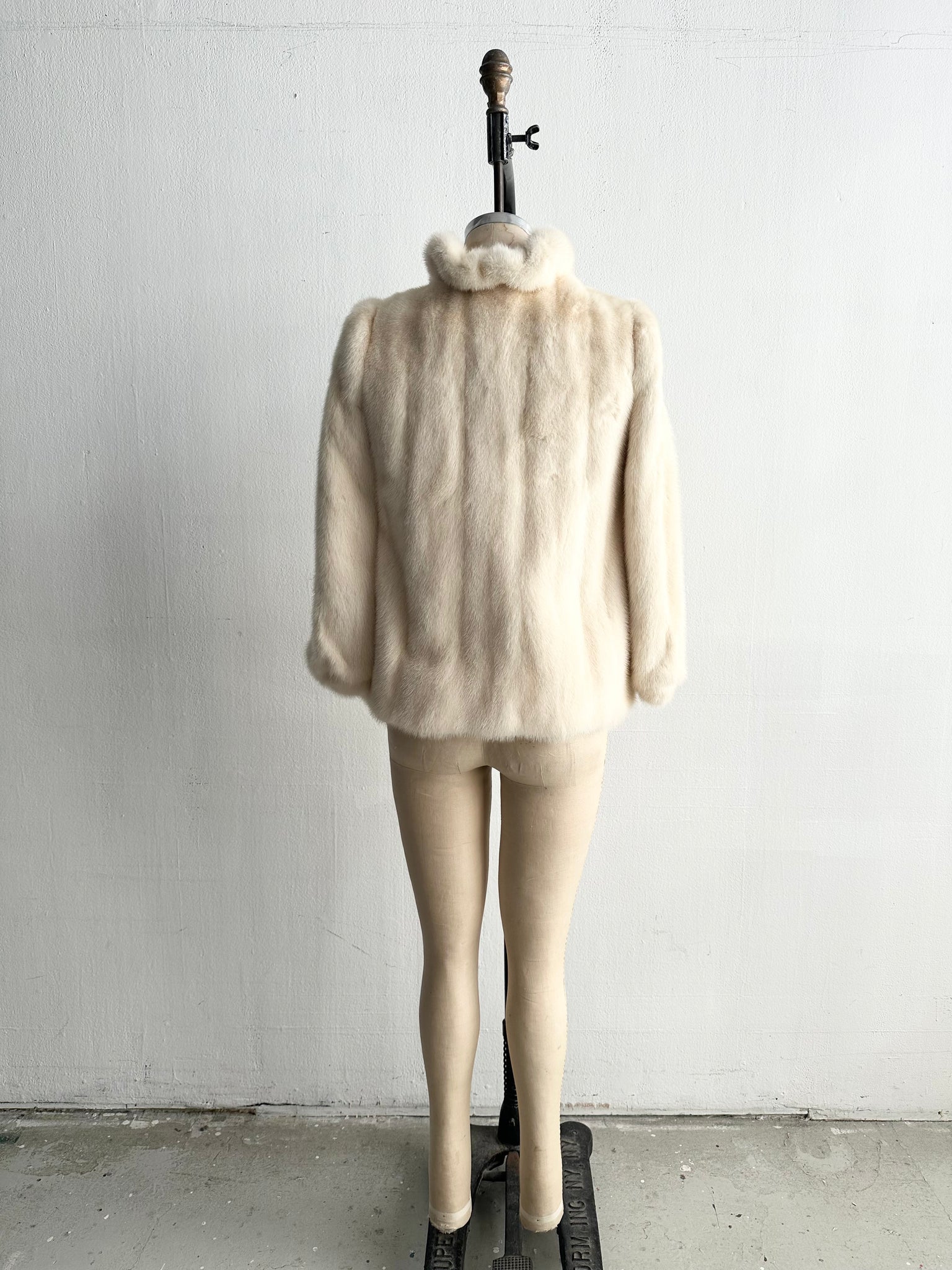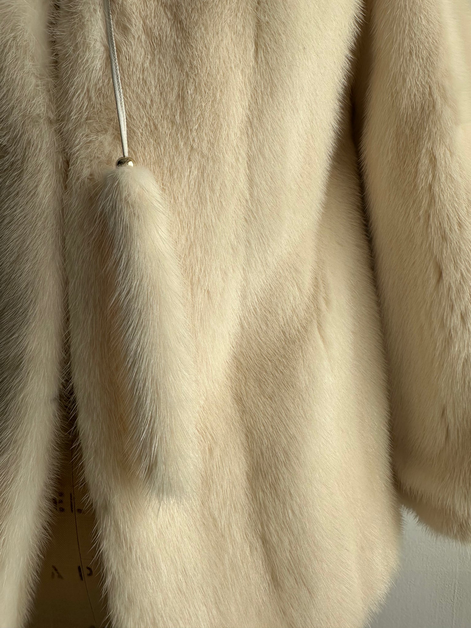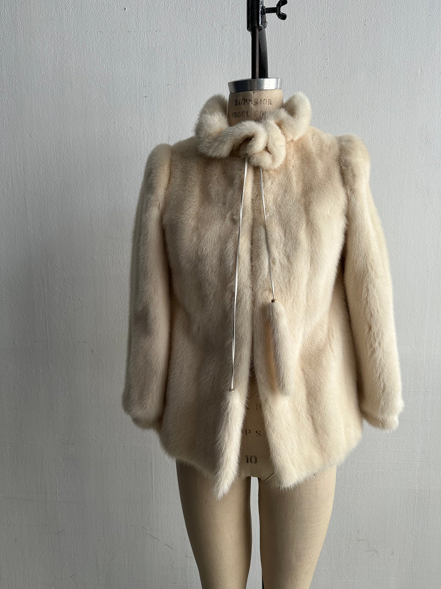 Description: Stunning and ultra rare white mink cropped evening jacket with a gathered collar, invisible hook and eye front closures, two mink collar tassels and two front hip pockets