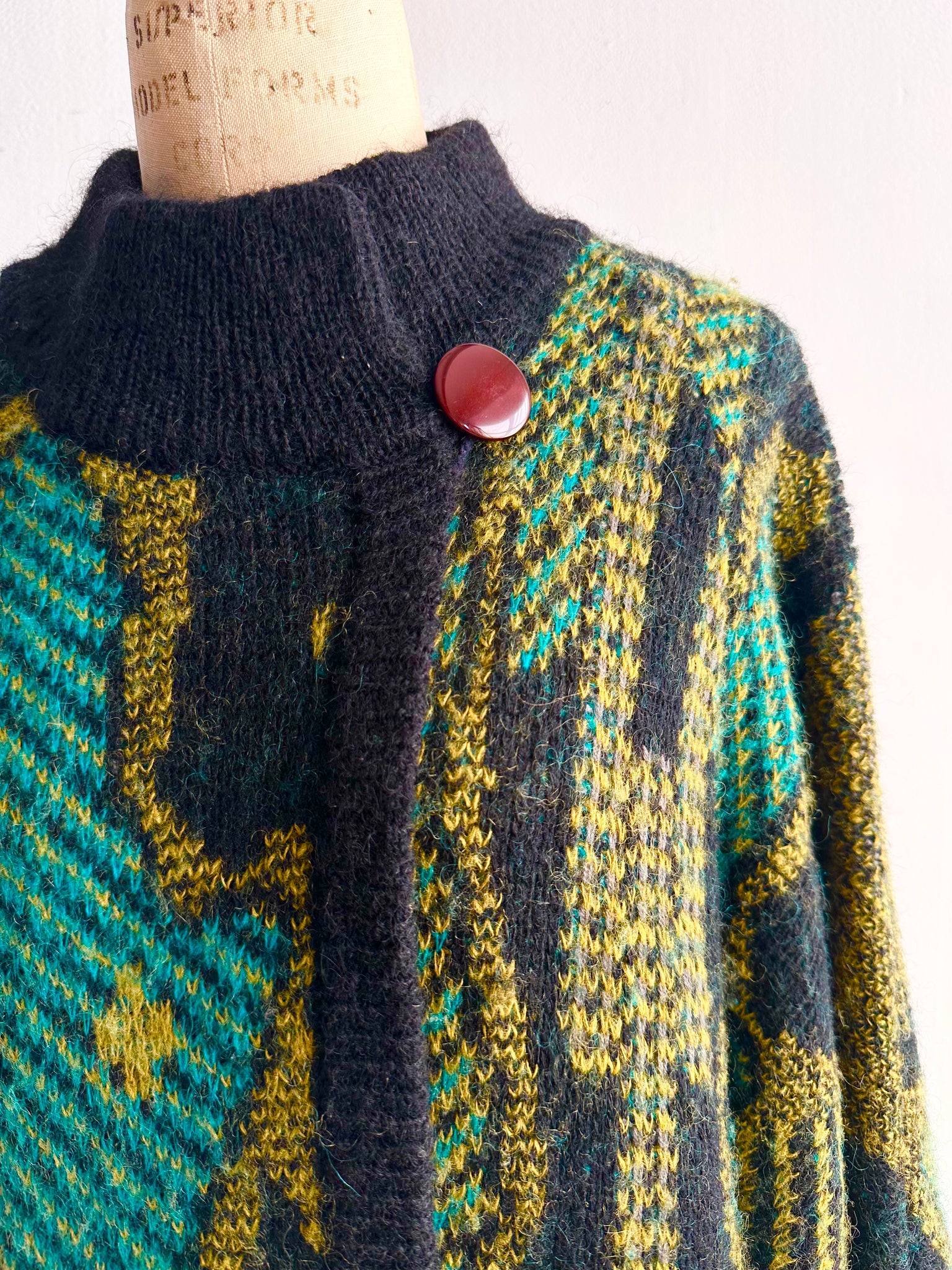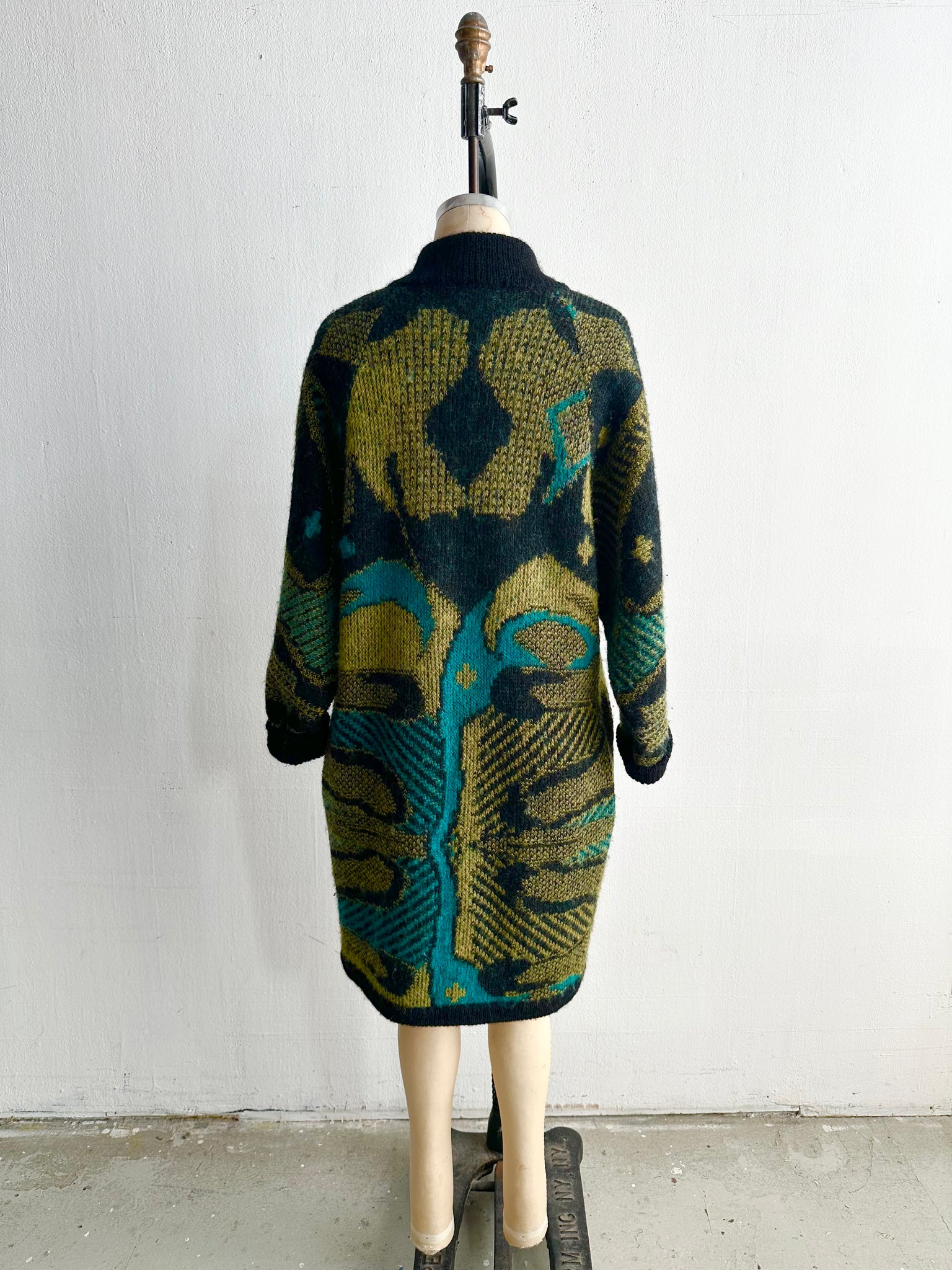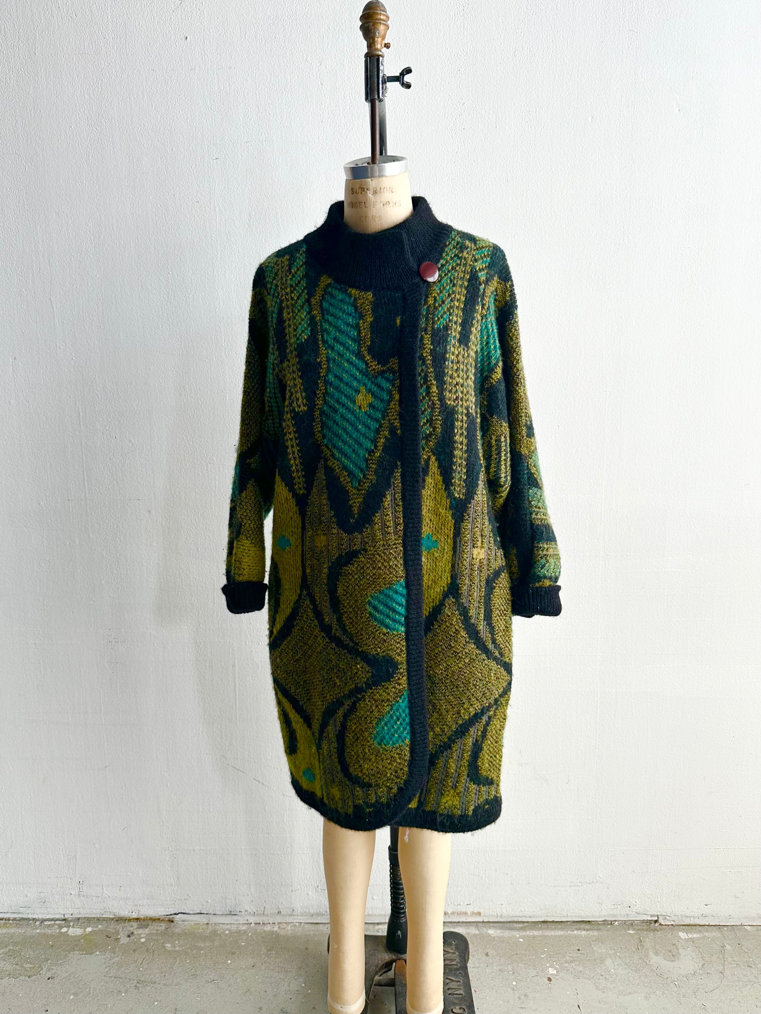 Description: This cozy and long sweater/jacket has a mock-neck neckline with a single large button asymmetrical front closure, two large front hip pockets and a turquoise, yellow, black and green abstract knit pattern throughout