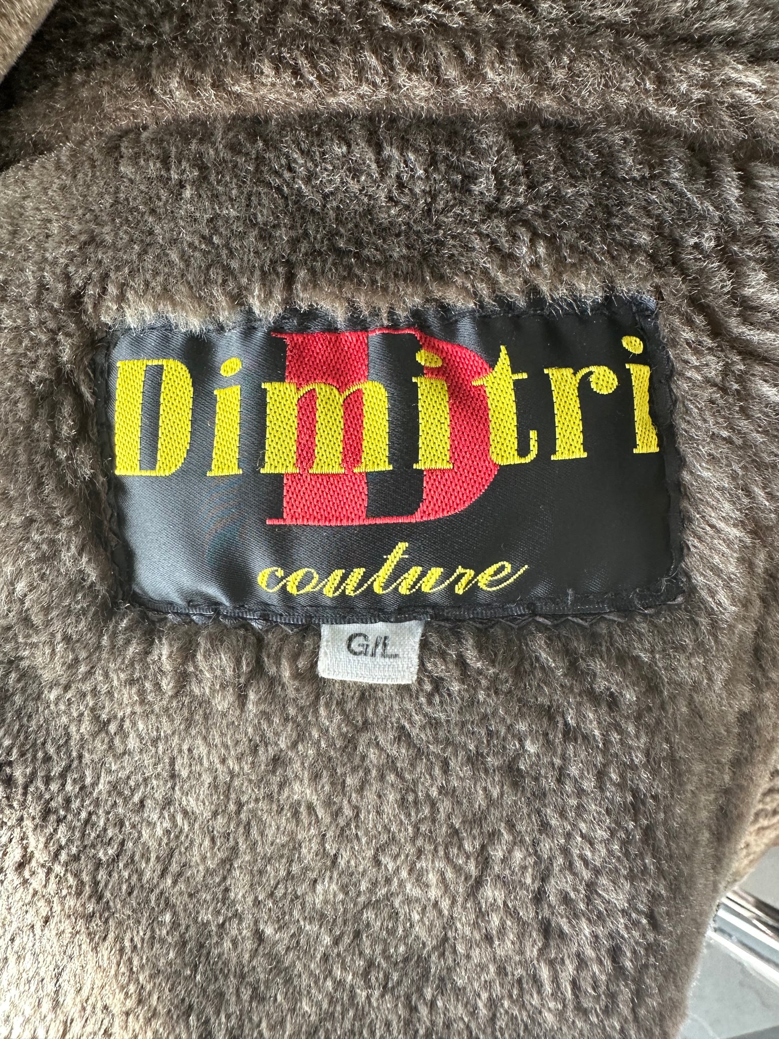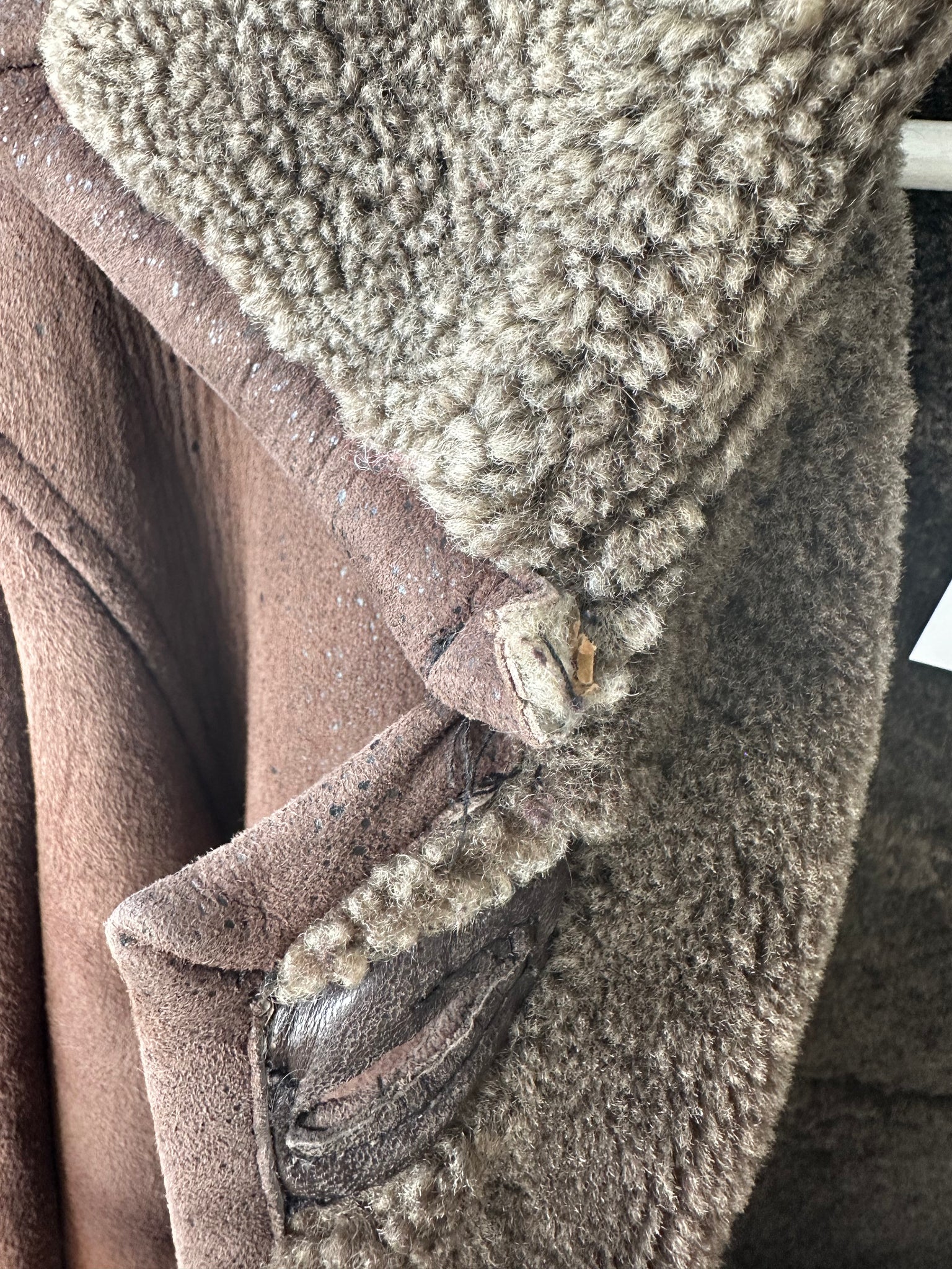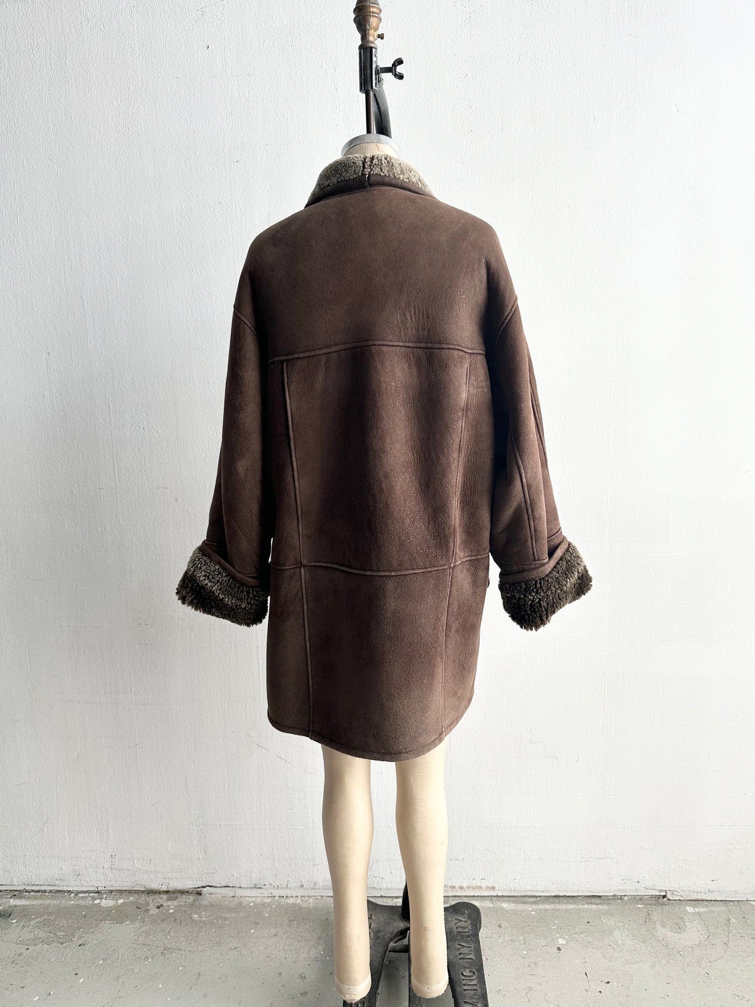 Description: Dark chocolate brown soft and lightweight long real shearling coat with a collar, wrist cuffs, two front pockets and a button down front closure