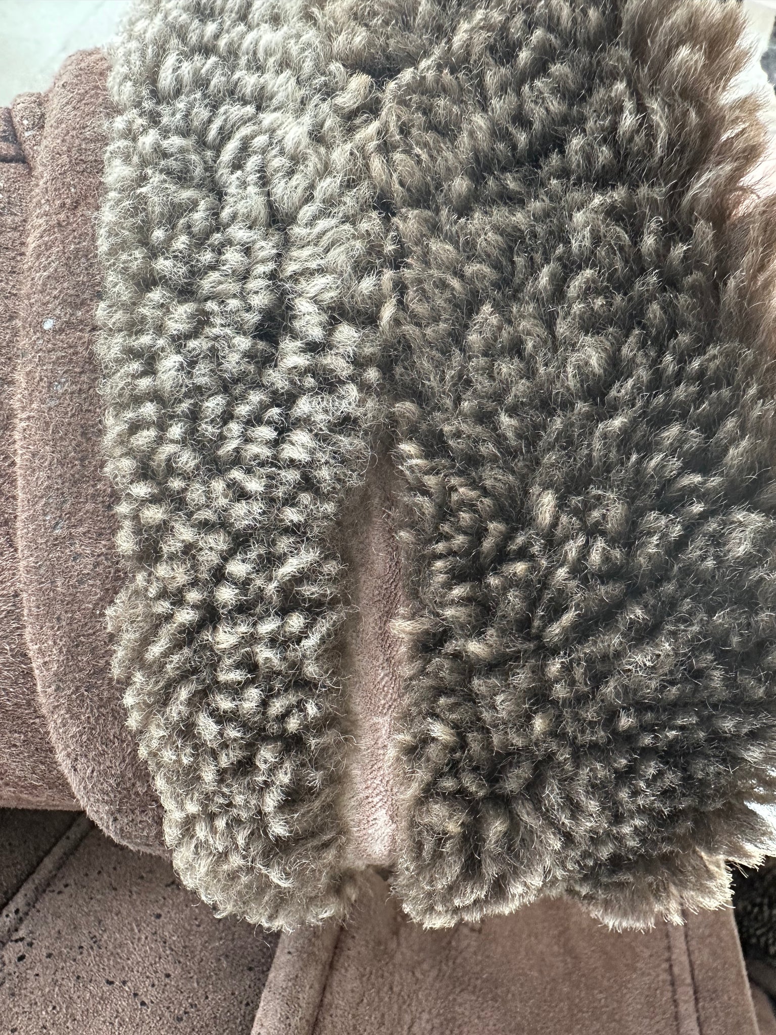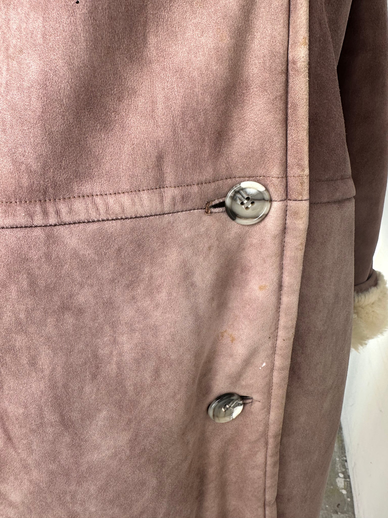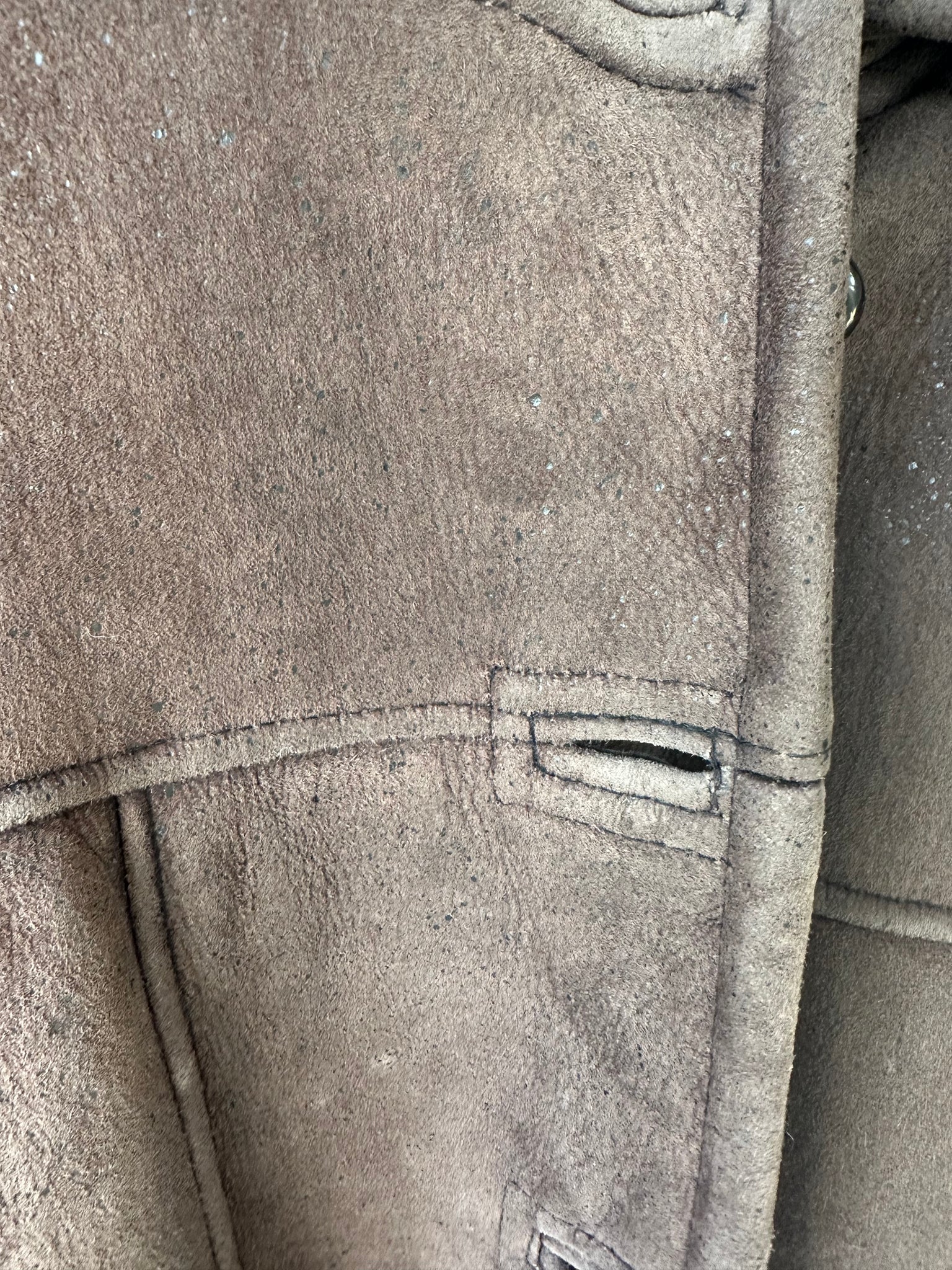 Description: Dark chocolate brown soft and lightweight long real shearling coat with a collar, wrist cuffs, two front pockets and a button down front closure
