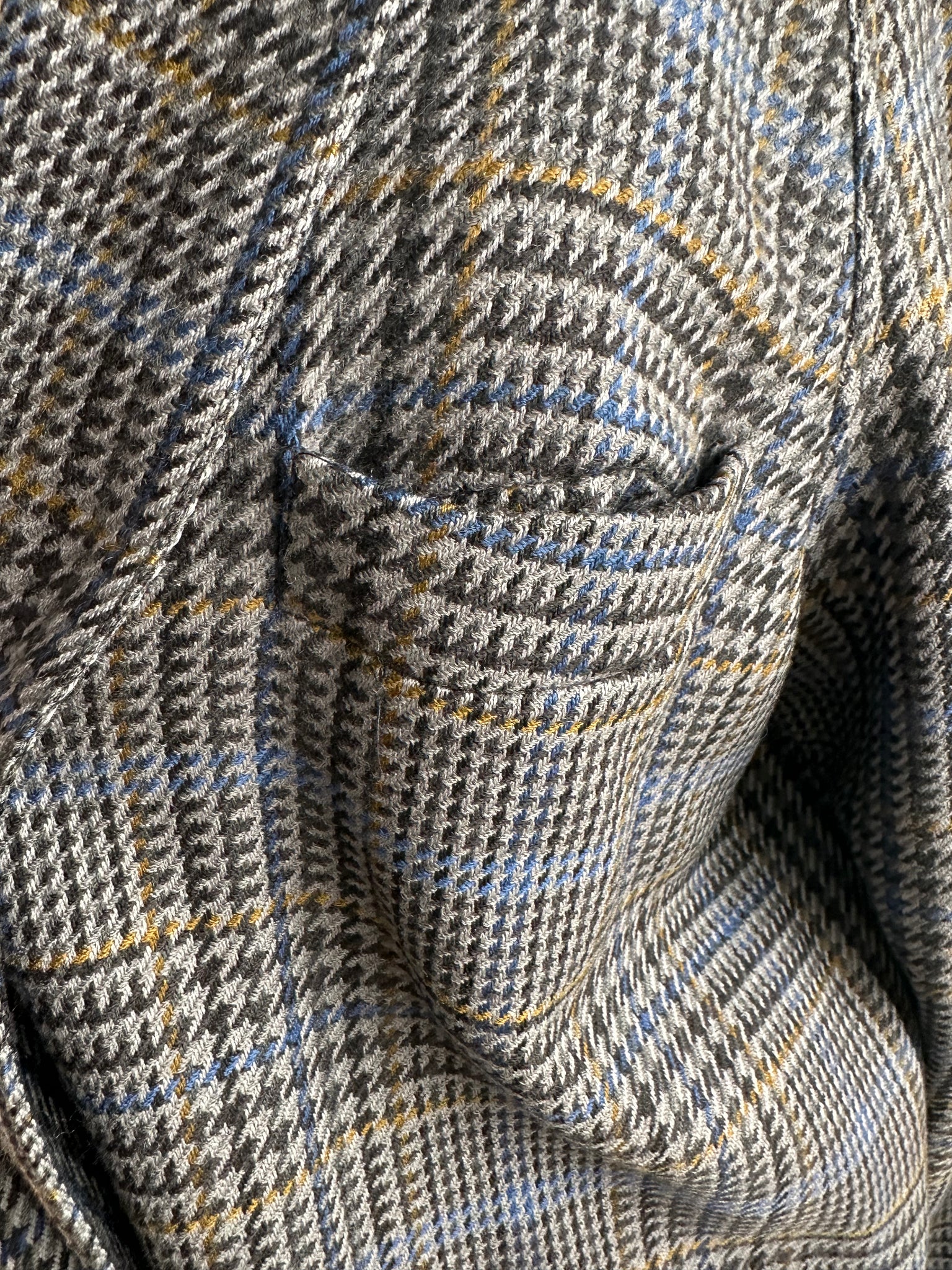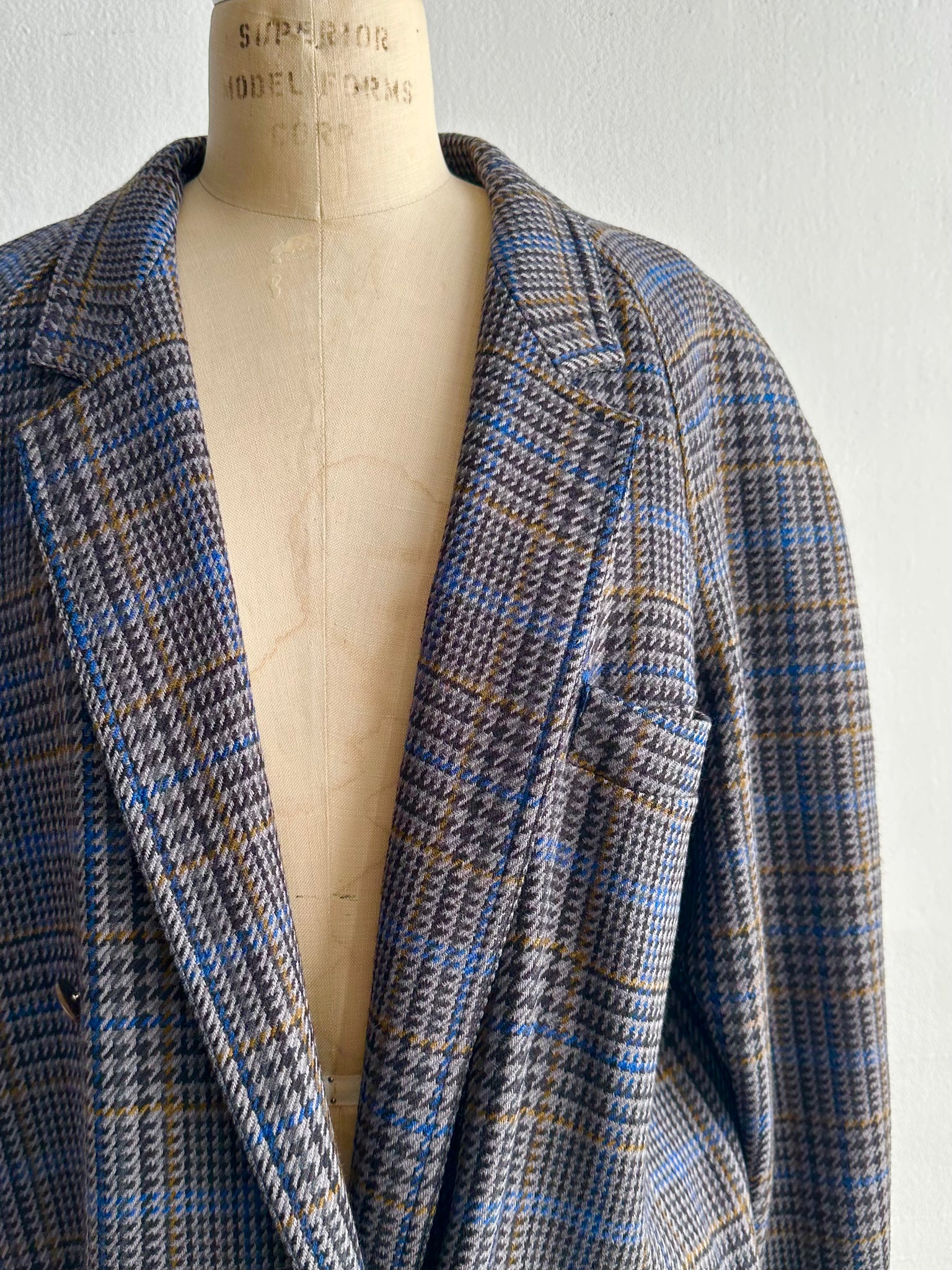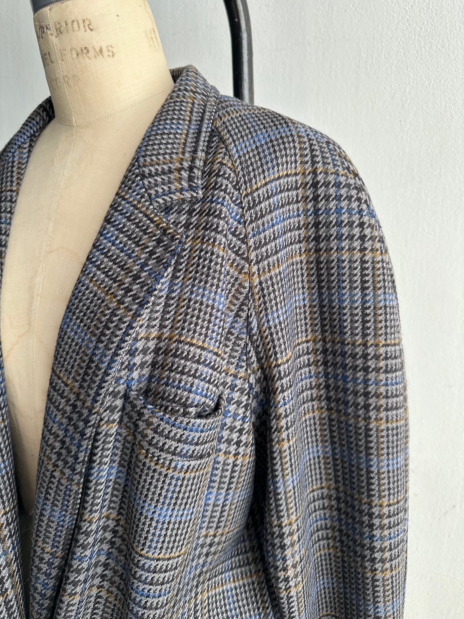 Description: This slouchy wool blazer has a single front button closure, a plunging neckline, two front hip pockets and a single breast pocket and a green, blue, grey and black houndstooth pattern throughout.