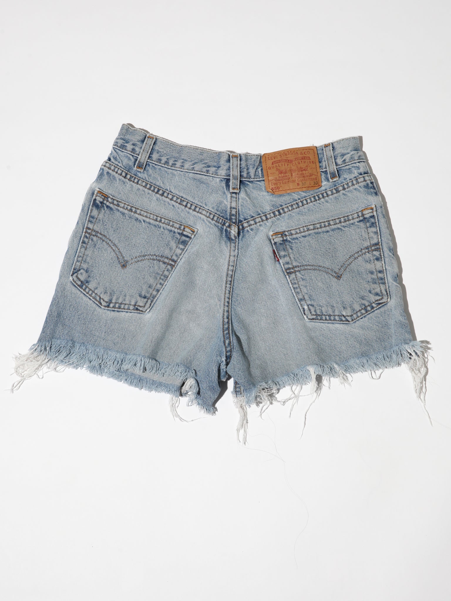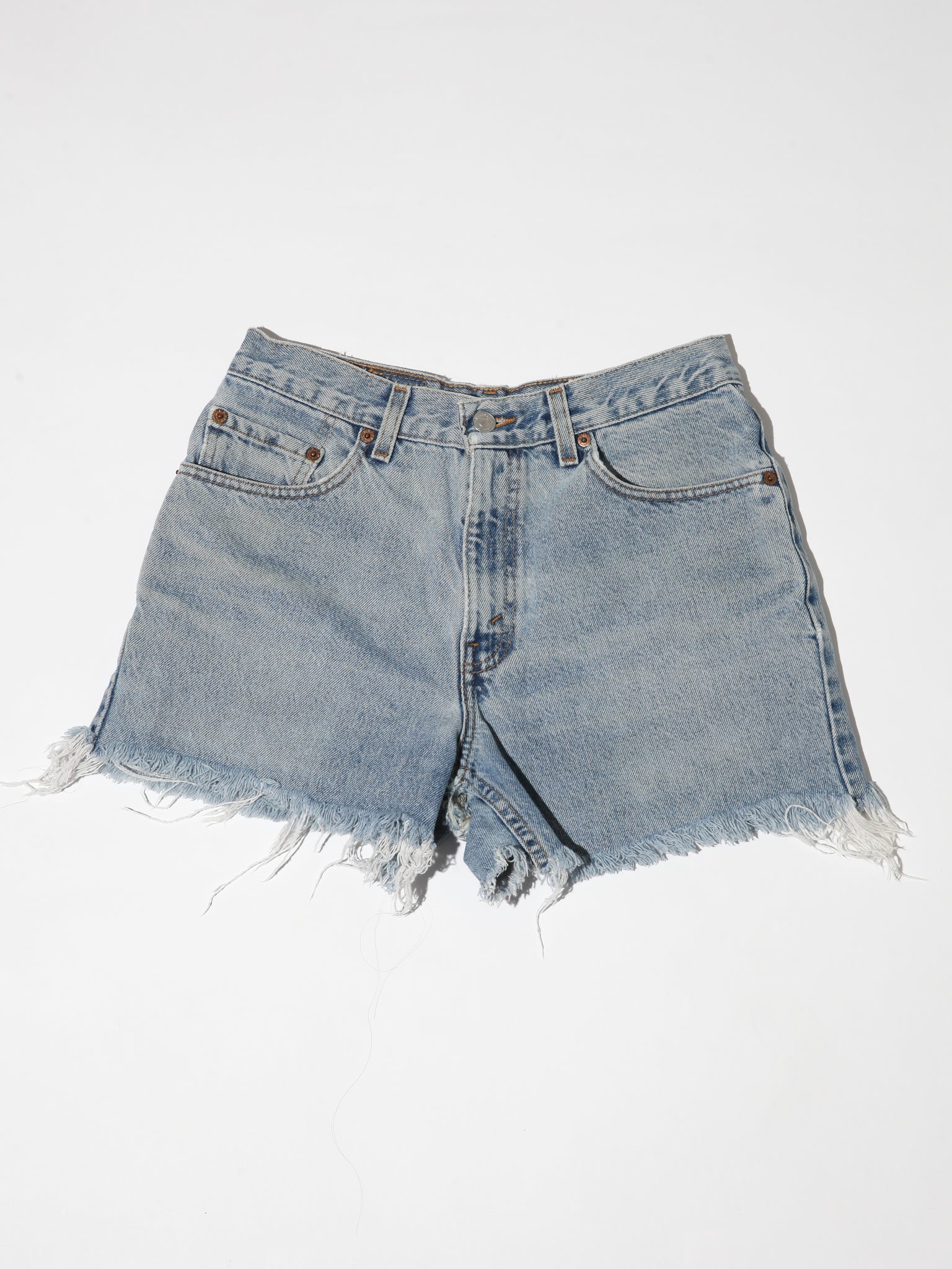 Description: Classic medium/light wash Levi's 550 denim cutoff shorts with a high waist front button and zipper closure. All cotton so no stretch