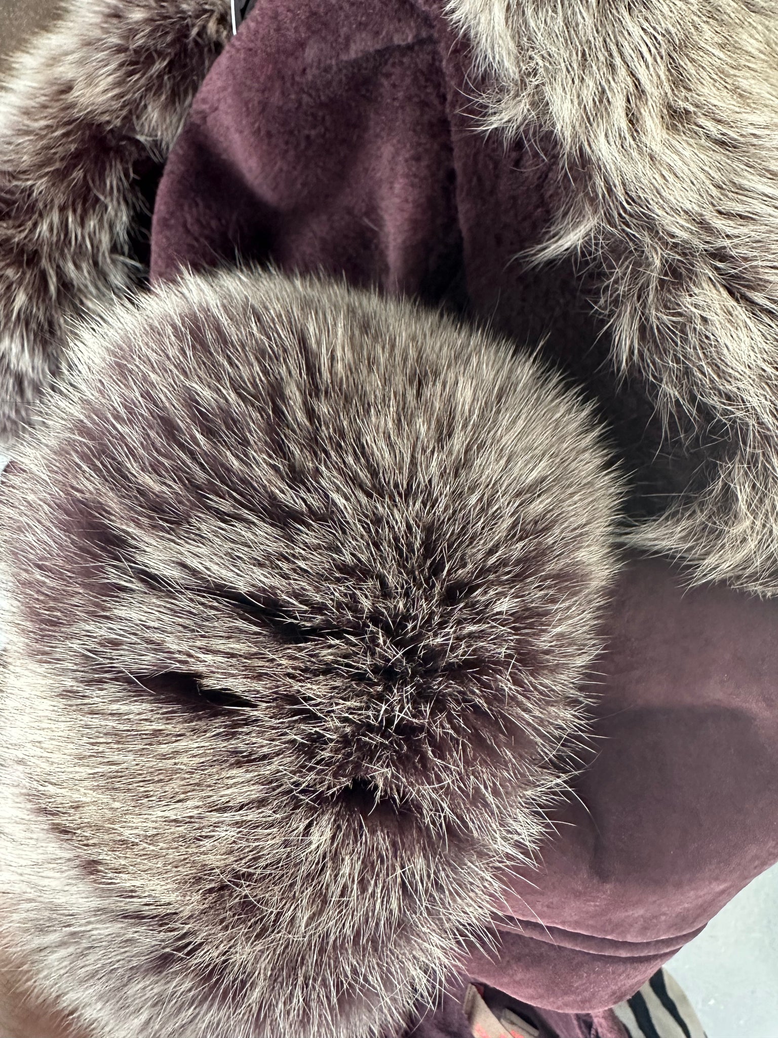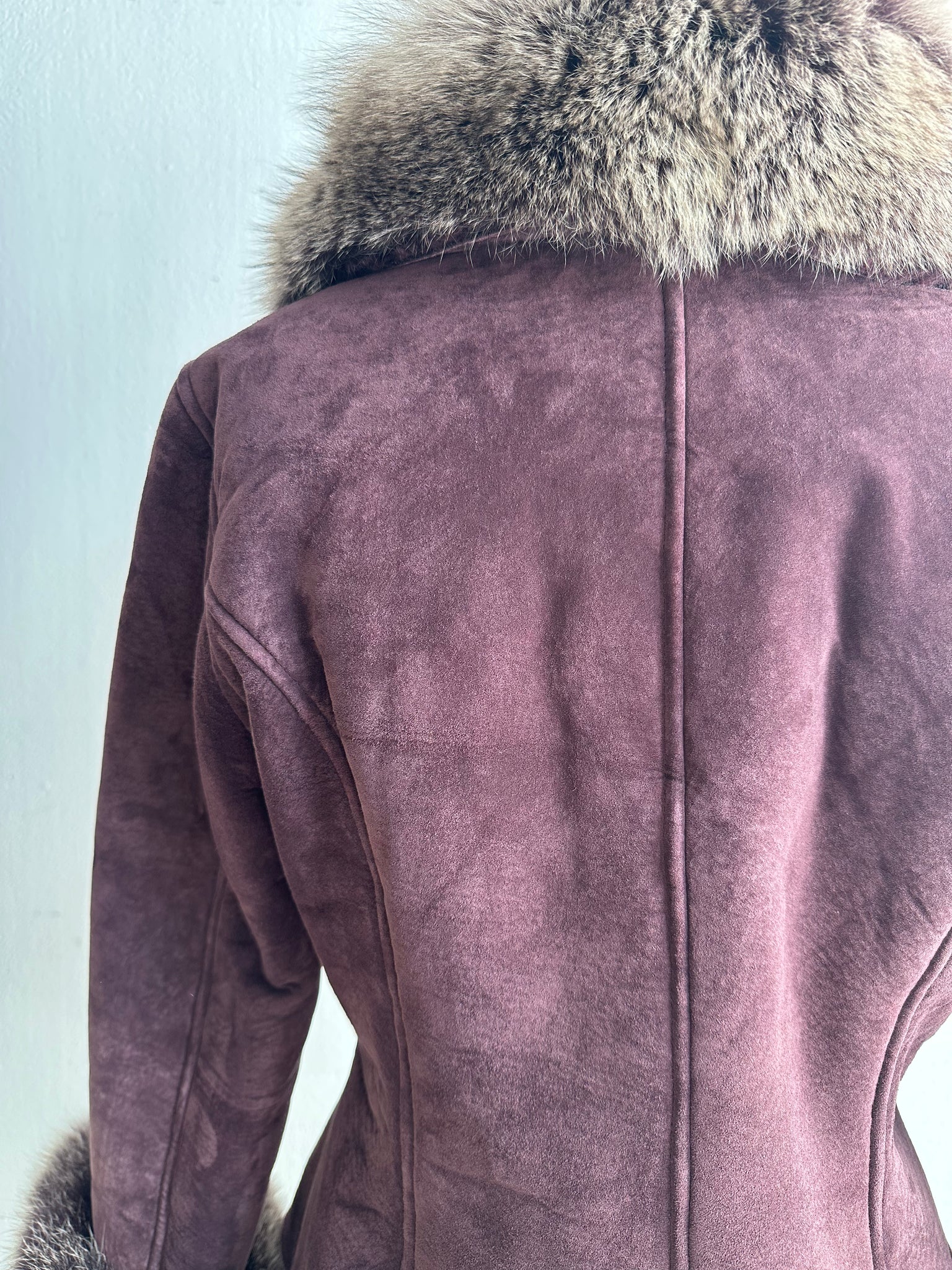 Description: This beautiful soft dark mauve real shearling short jacket has matching buttons as the front closure, two front hip pockets and ultra soft real fox detachable wrist cuffs and collar