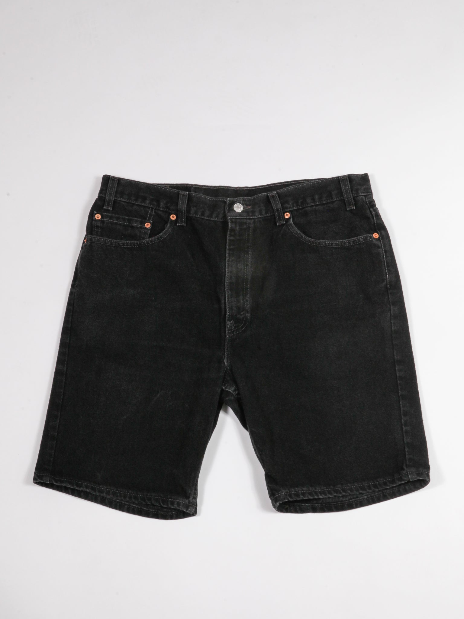 Description: Classic non-stretch black denim shorts with five pockets, three front and two back, belt loops and a front button and metal zipper closure.