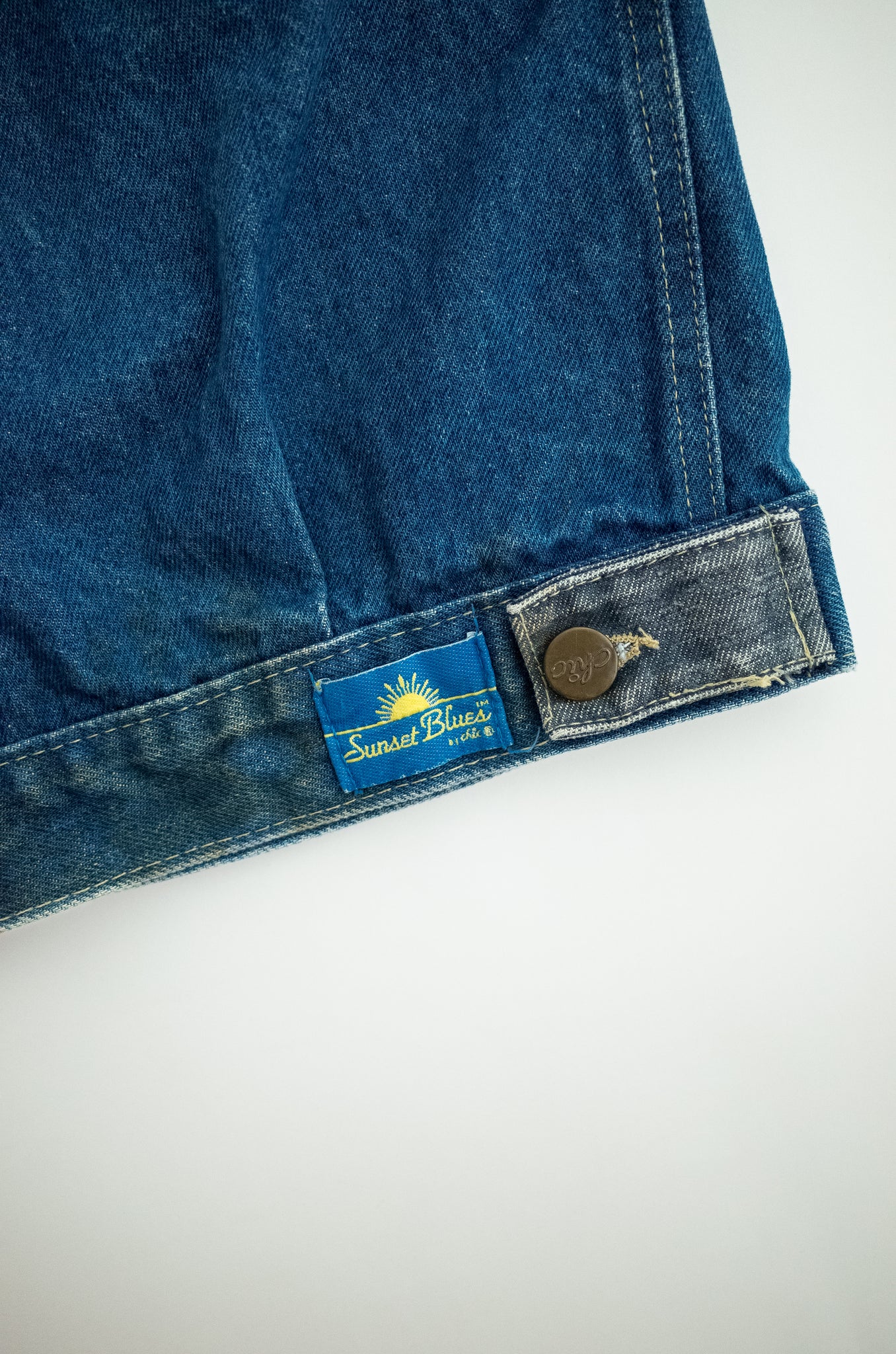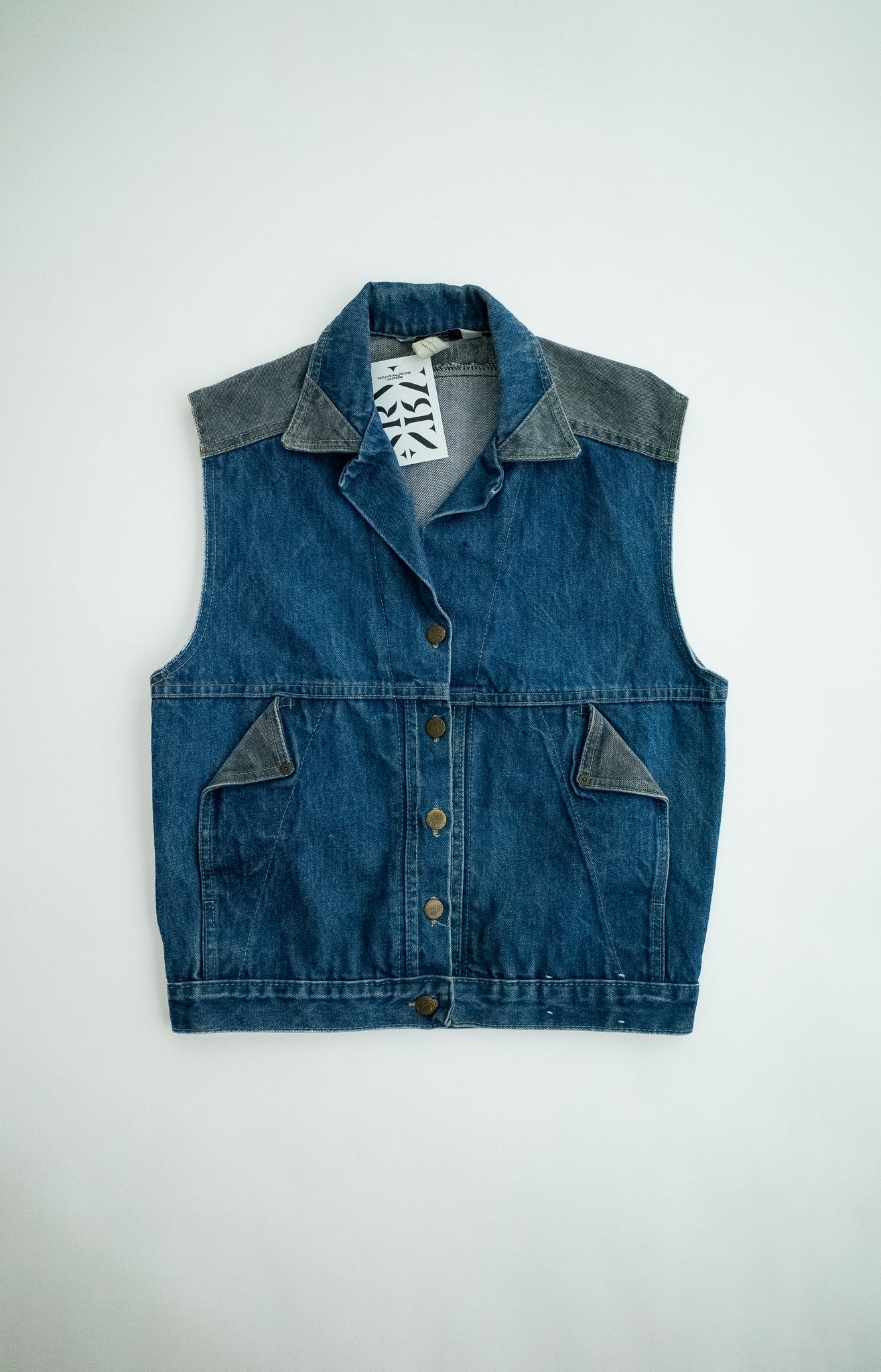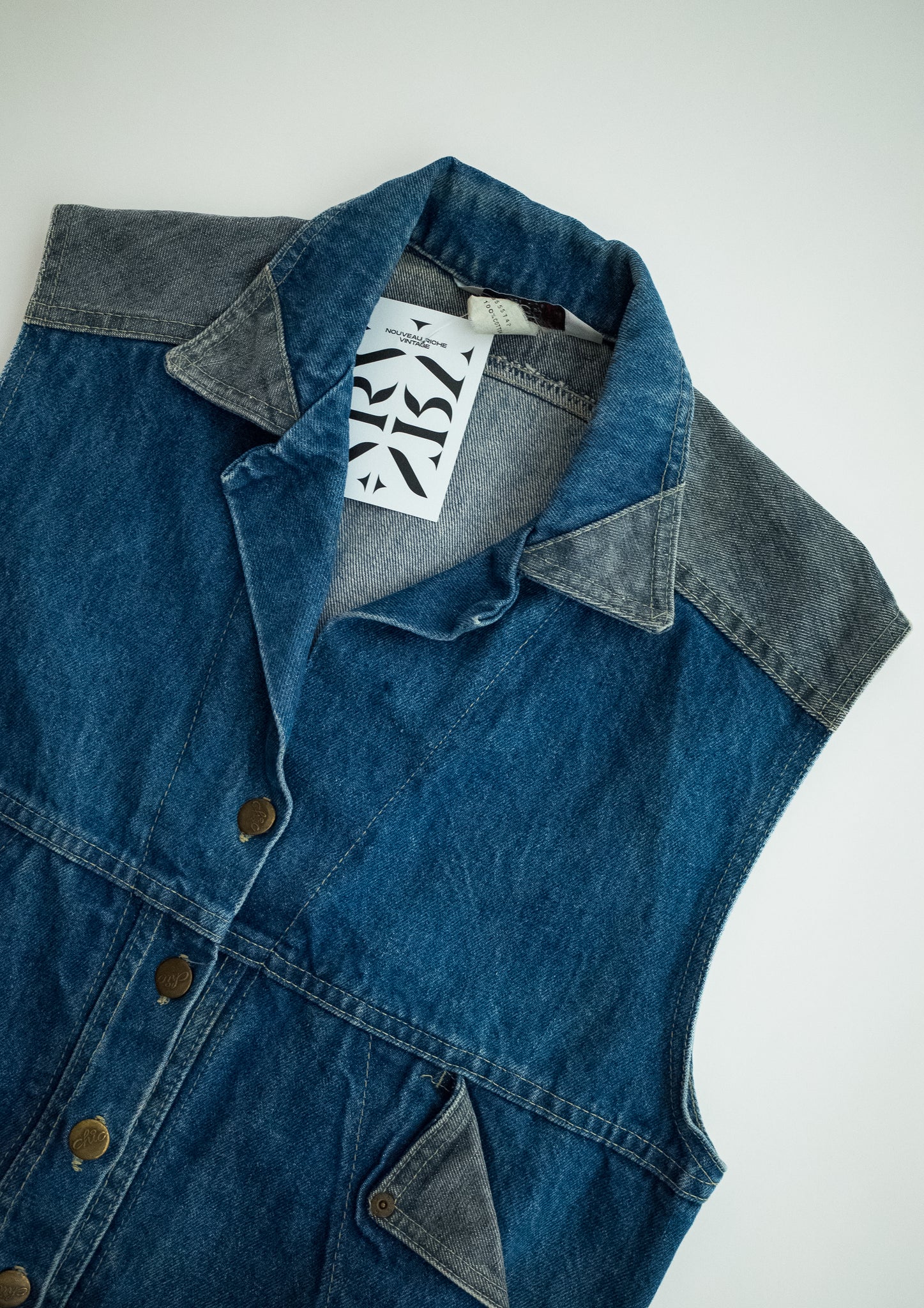 Description: Classic medium wash denim vest with a metal button down front closure, two front pockets and grey denim patchwork sections at the shoulders and collar
