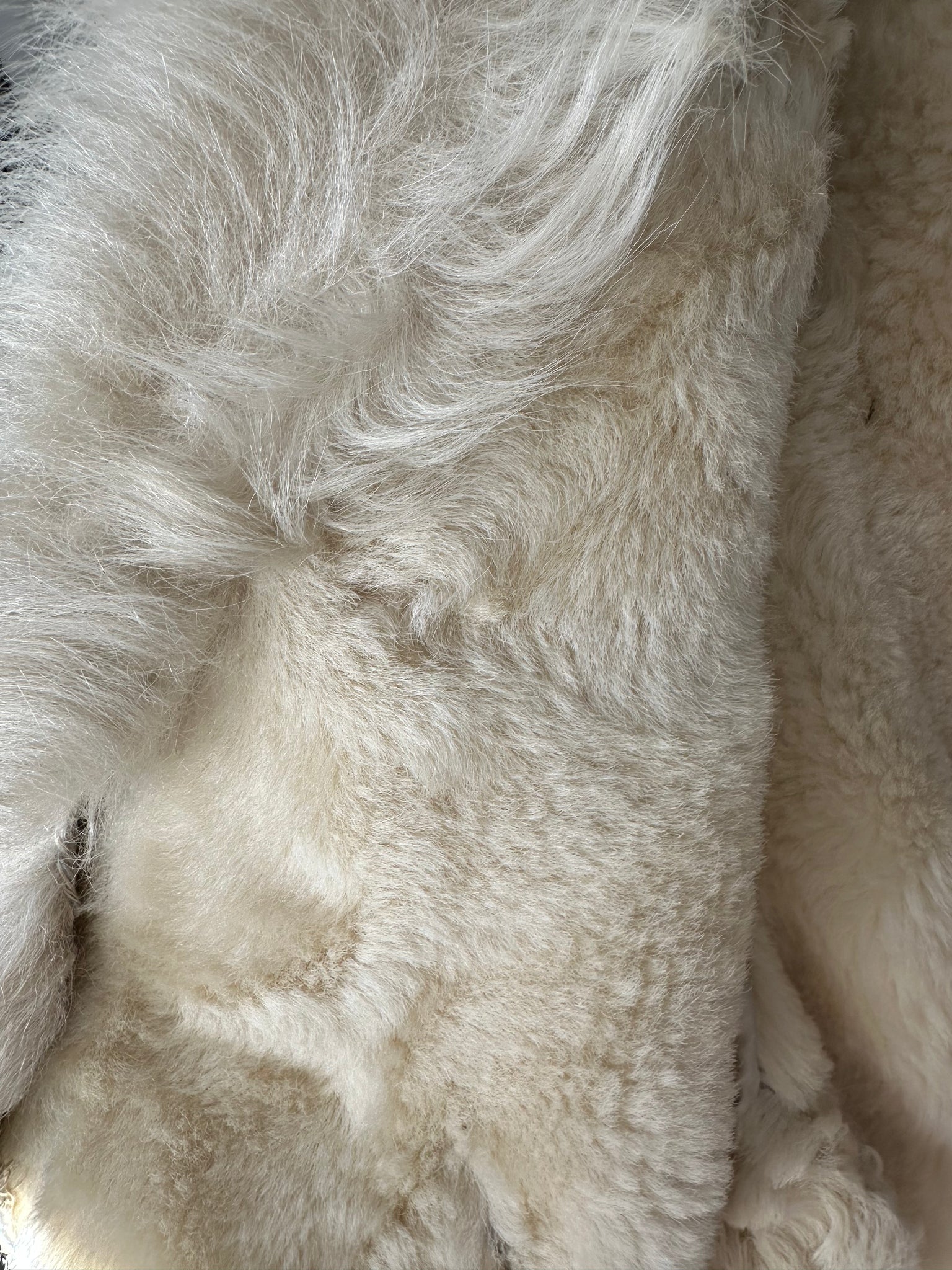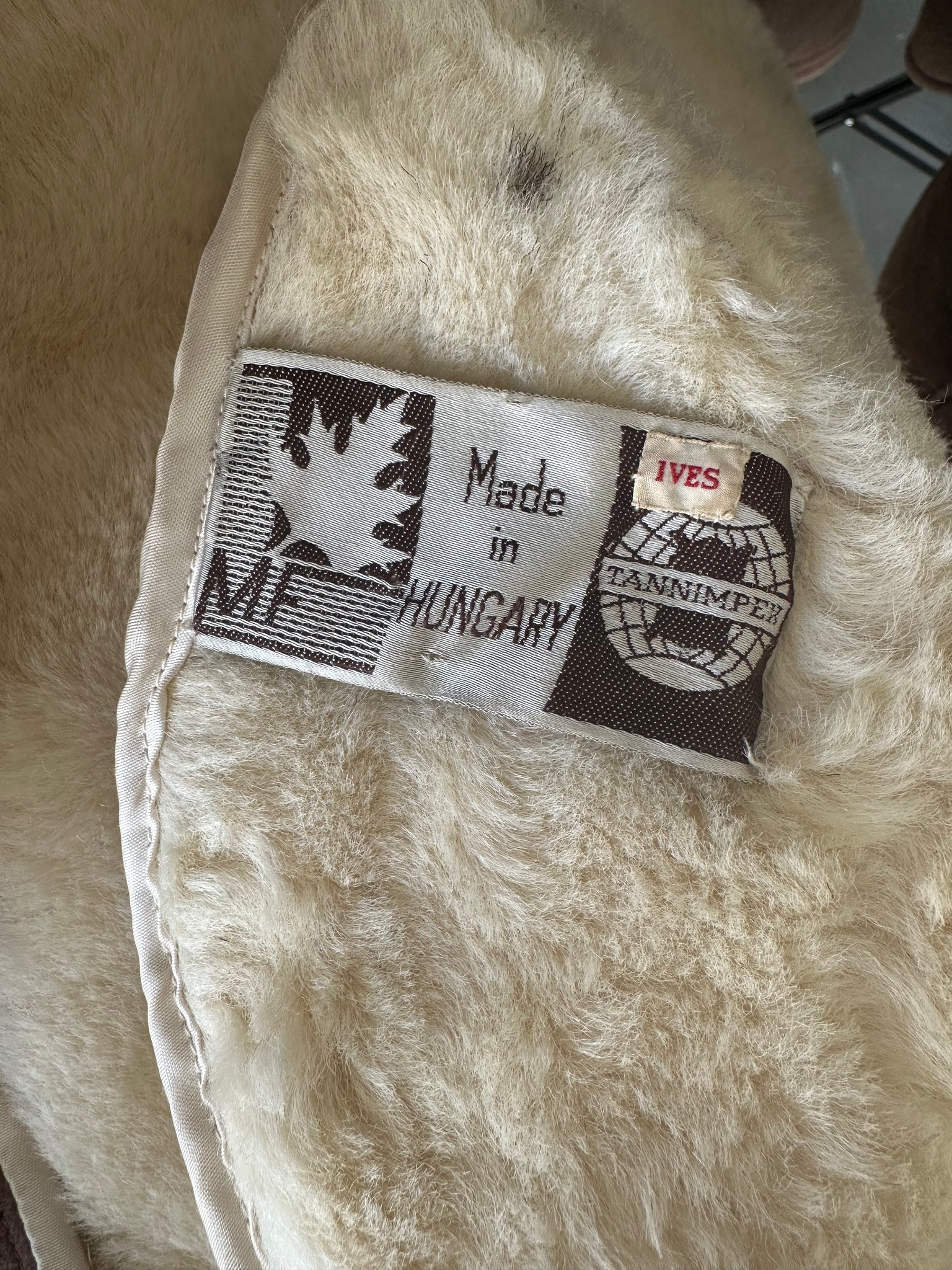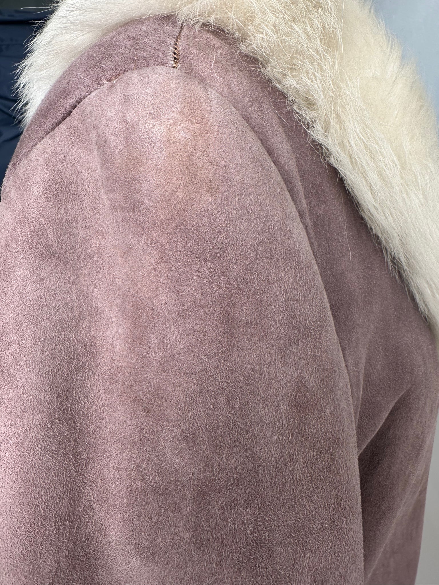 Description: Mauve button down mauve shearling jacket with cinched waist and fur cuffs and collar