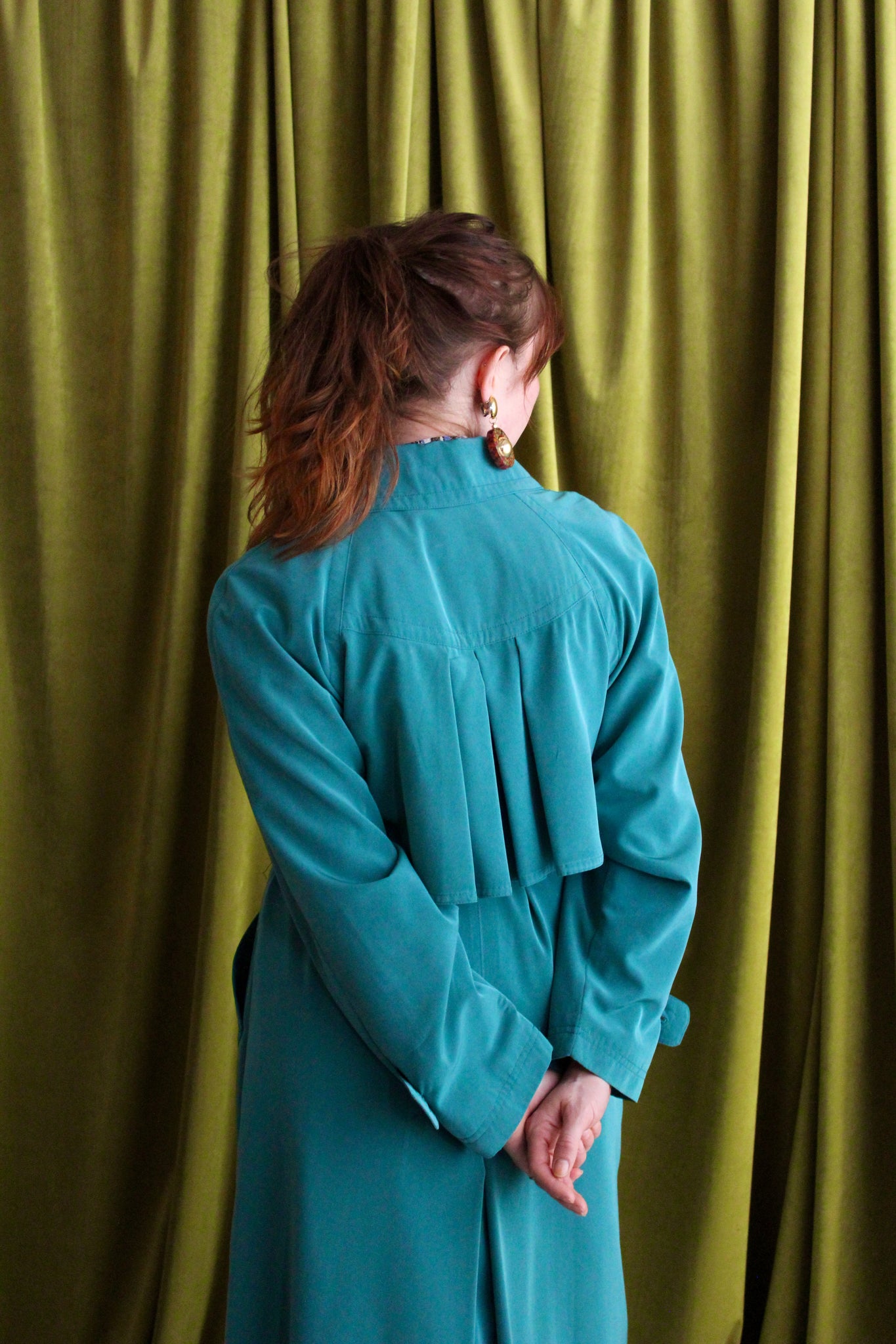 Description: Light jungle green long trench coat with emerald green buttons as the double breasted front closure, a pleated back vent, matching waist belt and two large front pockets