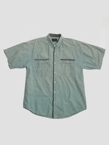Pale Green and Grey 80s Striped Cotton Button-Up Top with many pockets (mascM