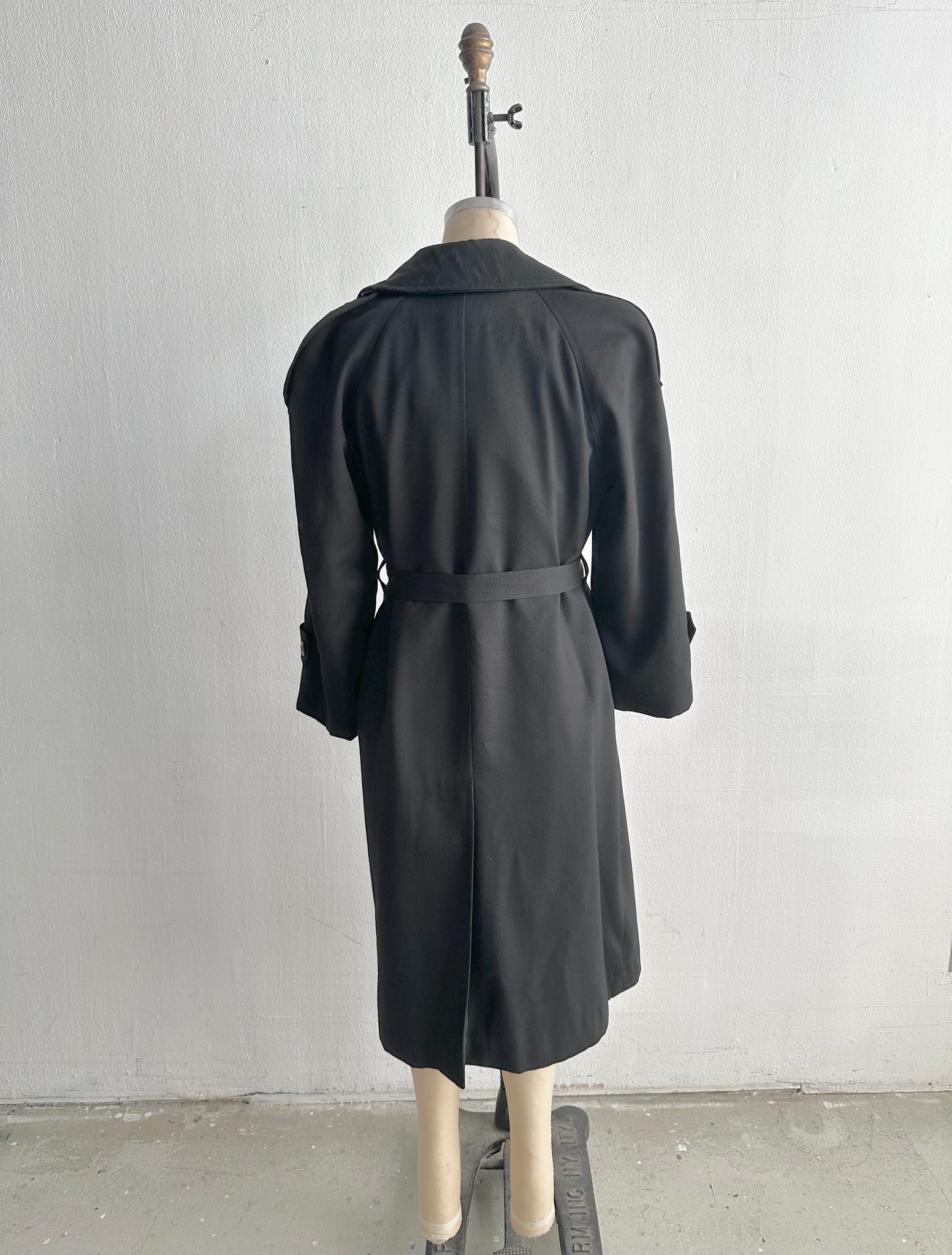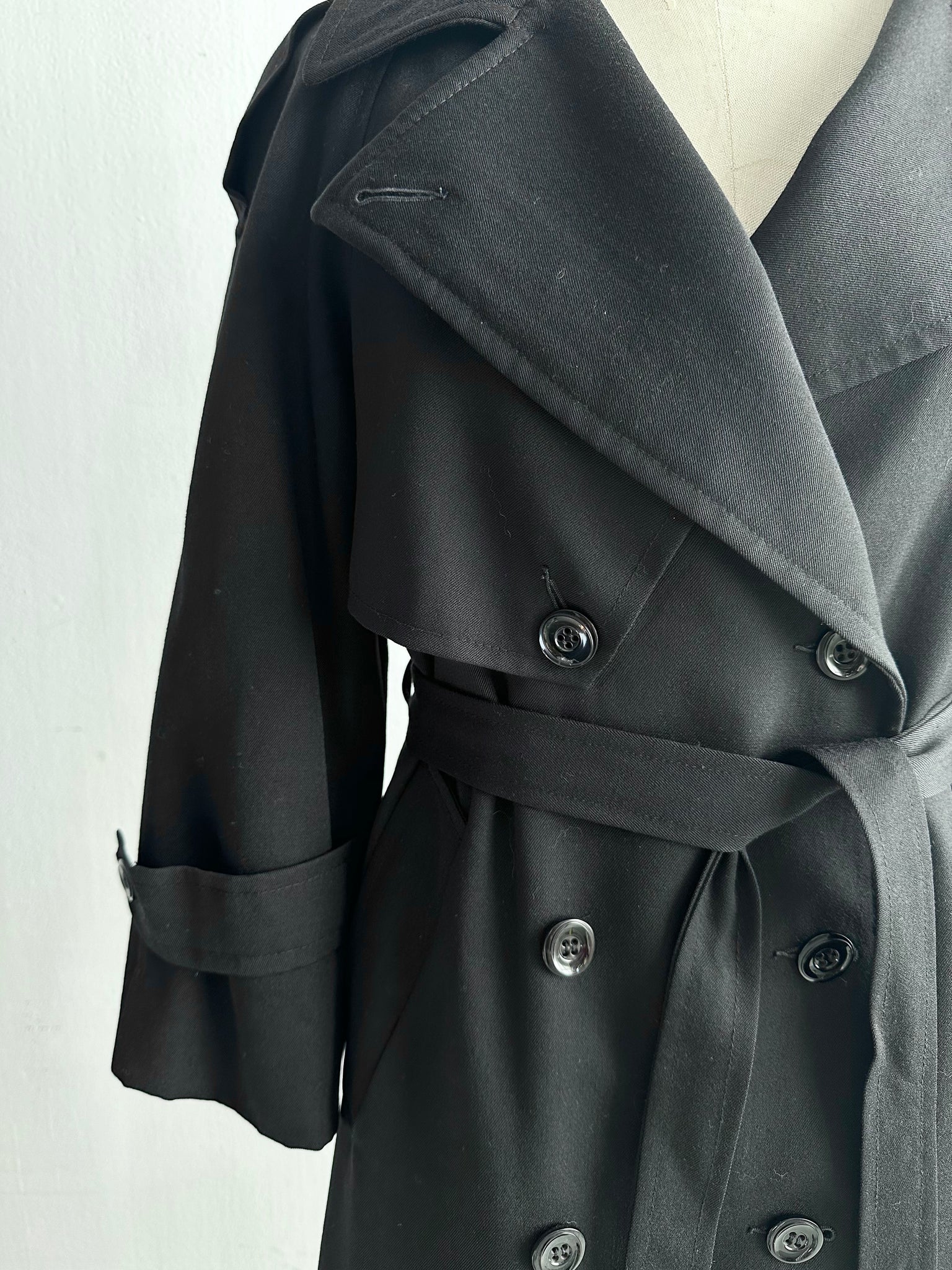 Description: Fit with its original belt and shoulder epaulettes, this classic black wool double breasted mid length trench coat is on the lighter side with matching black buttons as the front closure, large lapels and two hip pockets